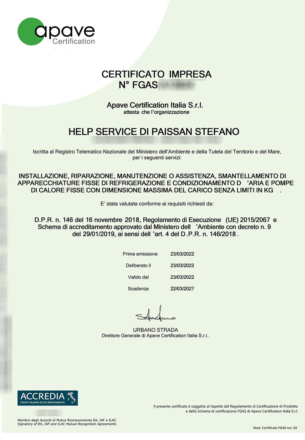 Il regolamento europeo F-GAS n°517/2014 che impone una riduzione nell’emissione di gas a effetto serra, ha modificato le soglie di frequenza nei controlli delle eventuali perdite degli impianti di condizionamento e refrigerazione. La nostra azienda è iscritta e certificata dal Registro FGAS.